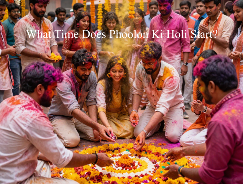 Phoolon Ki Holi is a special Holi celebration where flower petals are used instead of colours, held inside temples with devotional songs and prayers.