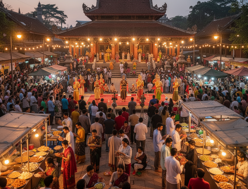 The combination of temple lights, devotional music, evening prayers, and active streets creates a unique spiritual atmosphere.